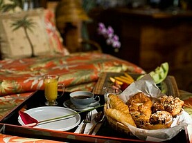 Jeden Morgen wird für Sie ein frisches Gourmet-Frühstück zubereitet: köstliche Quiche, frisches Obst der Saison, Joghurt, Muffins, Croissants, Kaffee und verschiedenste Teesorten.