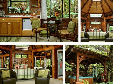 Die Cottages entsprechen dem zeitgenössischen Stil und haben durch ihre großzügige Einrichtung aus Holz und ihren Fenstern, welche vom Boden bis zur Decke reichen, einen ganz einzigartigen Charme. Sie sind zudem besonders gut geeignet für diejenigen, die sich nach Romantik in der Natur sehnen. Zu den Annehmlichkeiten gehören ein Privateingang, ein eigener Whirlpool, ein großes Badezimmer, ein eigener privater Balkon oder Lanai, ein Gasgrill, Wlan, ein Kühlschrank und täglich frisches Frühstück.