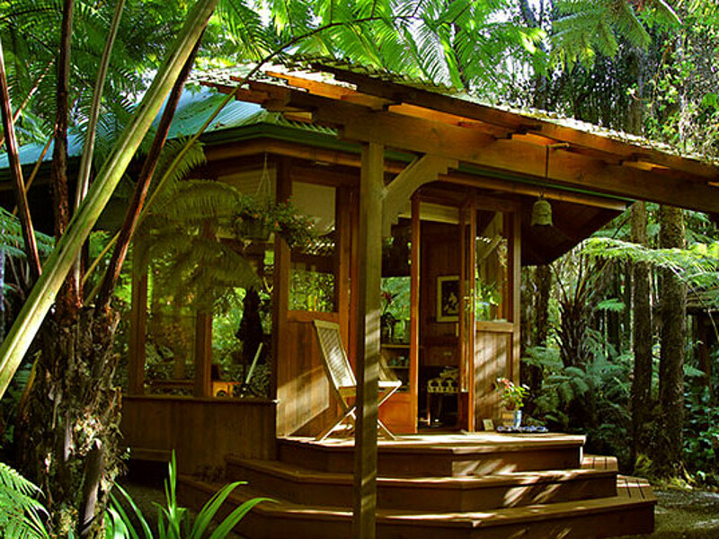 Das Volcano Rainforest Retreat ist traumhaft gelegen inmitten des heimischen, hawaiianischen Regenwaldes. Es bietet seinen Gästen vier ganz individuell gestaltete private Cottages, die übergangslos von der puren, wilden Schönheit der Natur umgeben sind.